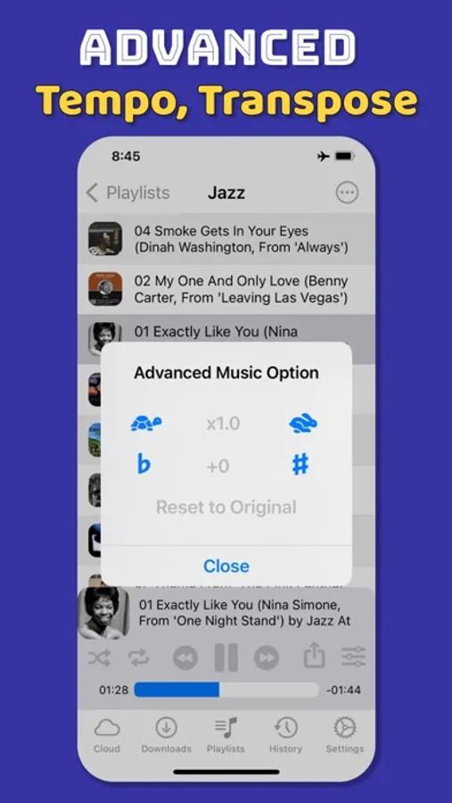- You can adjust the tempo and pitch (transposition) of the music.