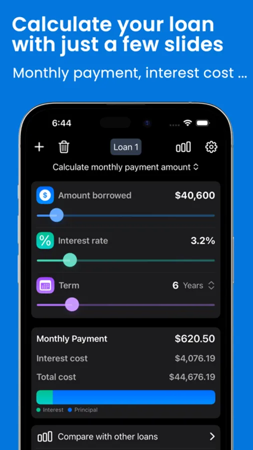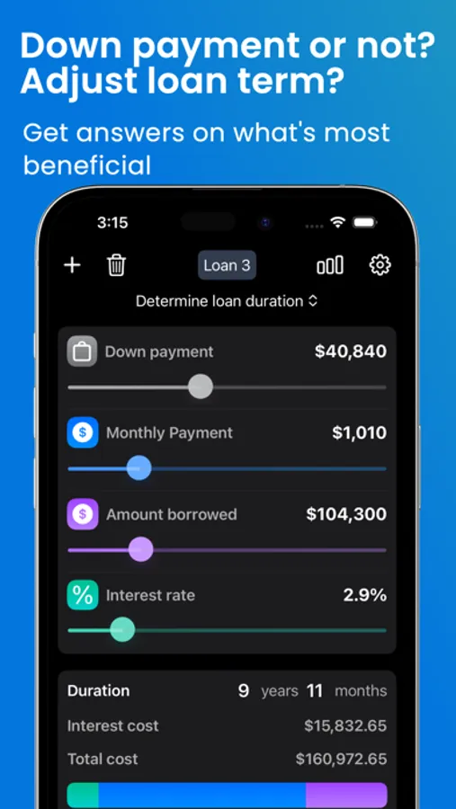 - Adjust your loan parameters in just a few slides and see real-time changes to determine your ideal term or the most relevant down payment