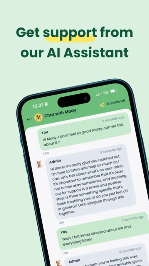 Mental Health Check-ins: Prioritize your emotional well-being with Mady's mental health check-ins. Set aside time to reflect on your feelings, thoughts, and overall mental state. You can also log your emotions, helping you recognize patterns and triggers over time.