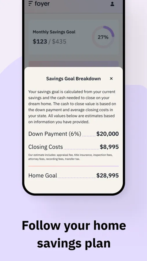 Our app is designed with first-time homebuyers in mind, offering customized planning features and resources to make the savings process easy to understand. Use the Foyer mortgage and home affordability calculators to determine how much you can actually afford and how to best plan for your savings goals. Follow your unique homebuying journey and make progress towards your goals.