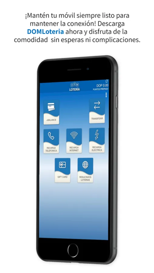 DOMLoteria es el canal digital que permite realizar compras de servicios a través de tu celular o dispositivos inteligentes de forma rápida y sencilla, recargando tu billetera electrónica a través de nuestros centros autorizados de recargas. Consulta en tiempo real resultados de sorteos.