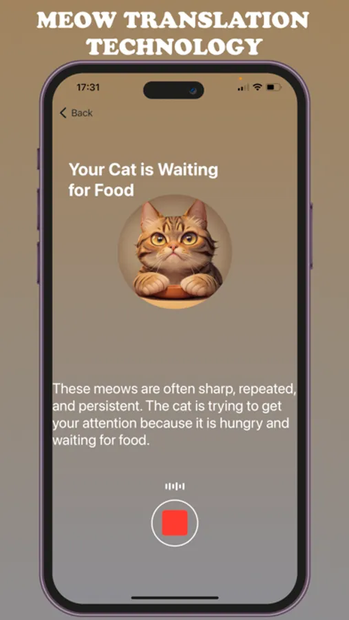 Meow Translation Technology: Utilize our sophisticated AI-based interpreter to decode your cat's meows. Whether they're feeling playful, asking for food, or needing some extra love, our app analyzes the sound patterns to reveal your cat's mood and needs in real-time.
