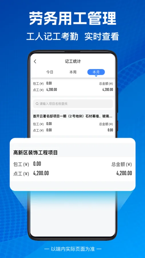 记工报表:项目施工班组记工数据同步上传,实时掌握项目劳务用工情况,科学统筹组织施工;