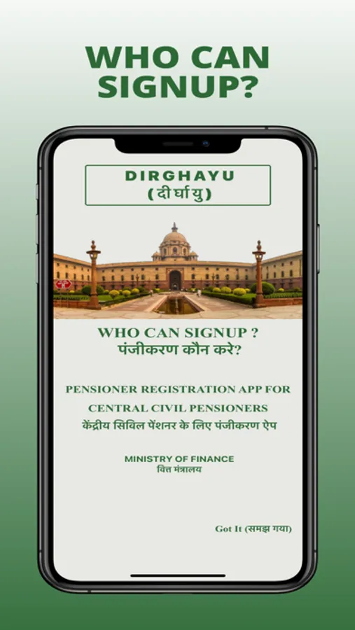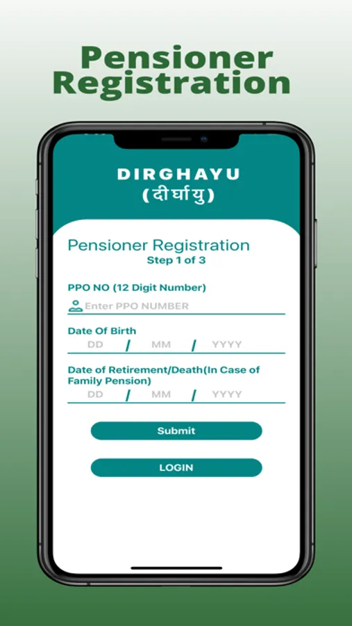 Pensioners/ Family Pensioners can register on the DIRGHAYU Mobile APP by providing PPO number, Date of Birth & Date of Retirement/Date of Death (in case of Family pensioner).
