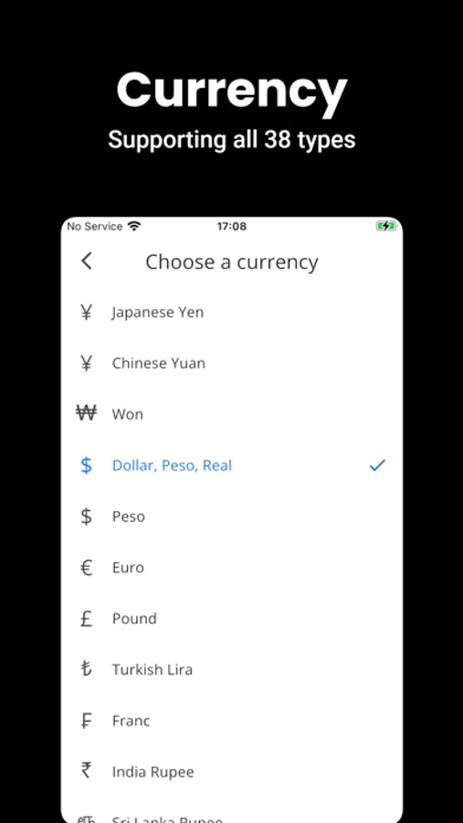 • Currency: Japanese Yen / Chinese Yuan / Won / Dollar / Peso / Real / Euro / Pound / Turkish Lira / Franc / India Rupee / Sri Lanka Rupee / Baht / Kip / Riel / Kyat / Kina / Don / Piso / Ruble / Manat / Togrog / Gourde / Loti / Rand / Cedi / Colon / Naira / Taka / Leu / Lek / Lempira / Quetzal / Guarani / Florin / Pula / Dram / Hryvnia / New Israel Sheqel / Krone / Rupiah
