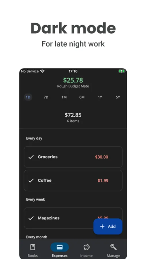 • Review income and expenses on a "daily", "weekly", "monthly", "6-month", "annual", and "5-year" basis.
