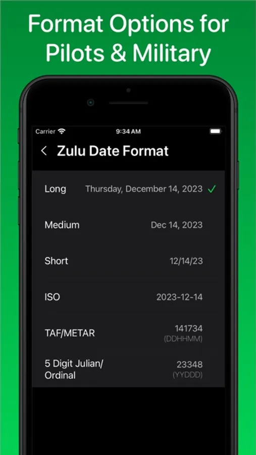 • Customizable Time and Date Formats: Tailor the app to your preferences with configurable time and date formats. Choose between 24-hour, 12-hour, or Military time formats, and select from options like long, medium, short, ISO, TAF/METER, and 5-digit Julian (ordinal) date formats.