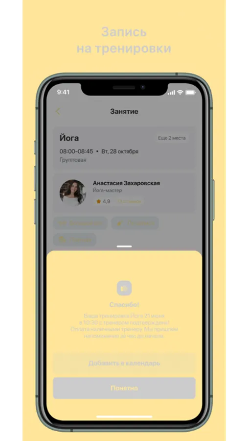 - Получать PUSH-уведомления о предстоящей тренировке за 3 часа
