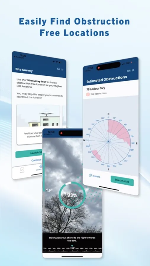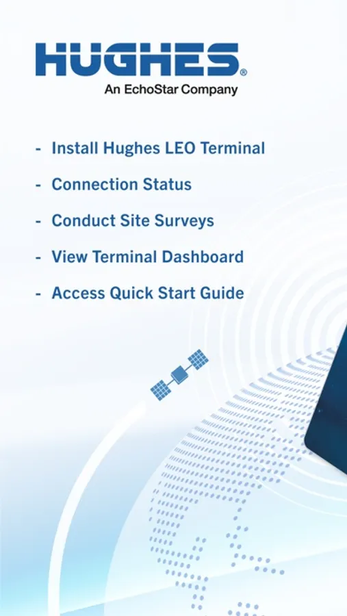 The Hughes LEO mobile app enables technicians and end-users to conduct location site surveys and commissioning of the Hughes LEO satellite terminal through the terminal Wi-Fi connection.