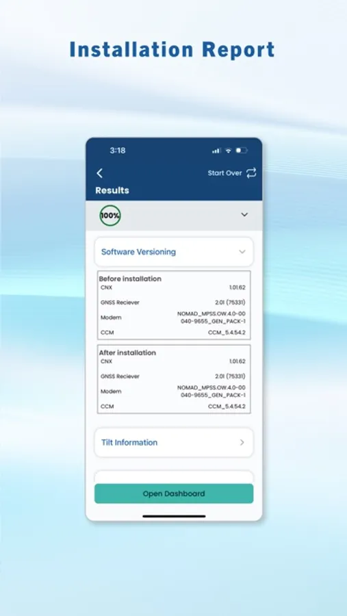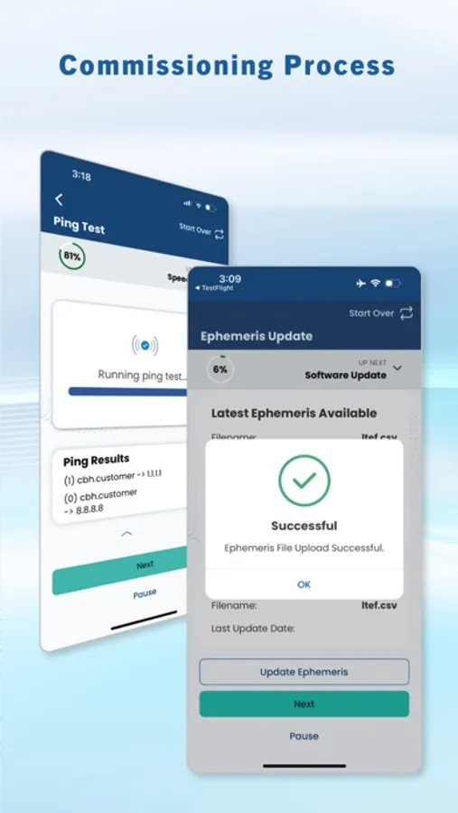 The app guides the installer through a self-explanatory workflow to commission the terminal and enable satellite connectivity