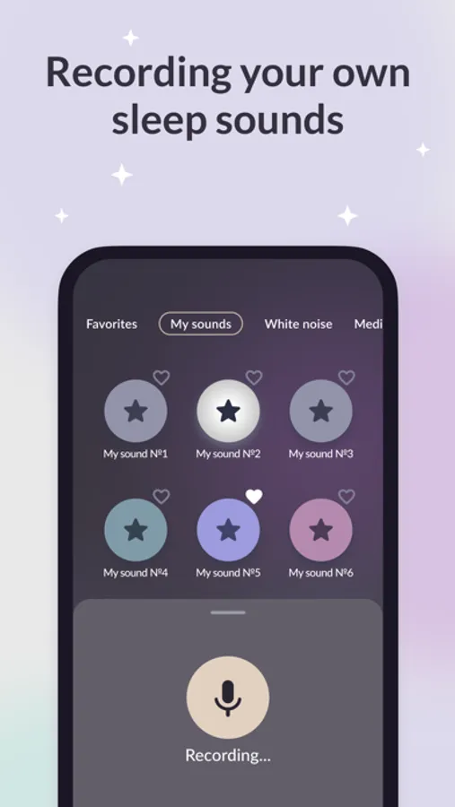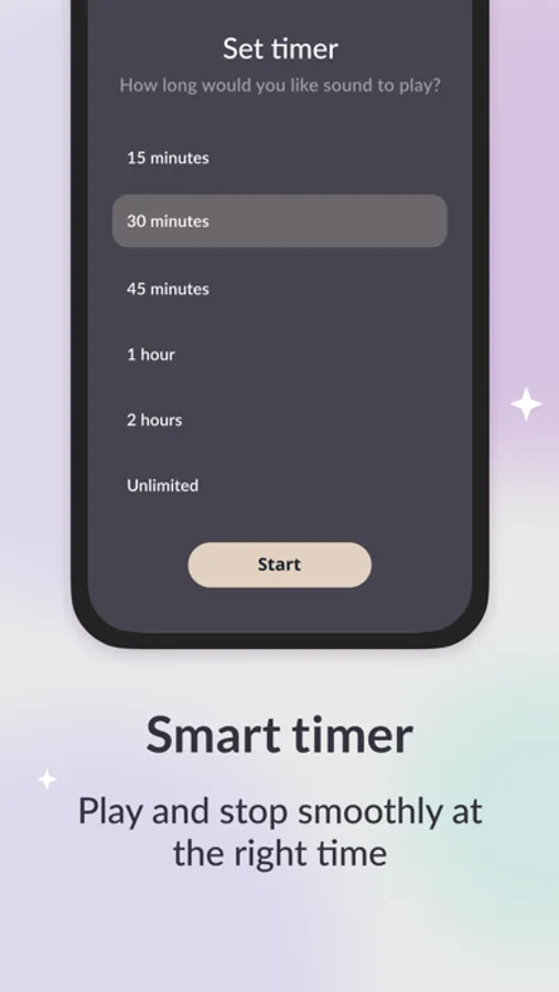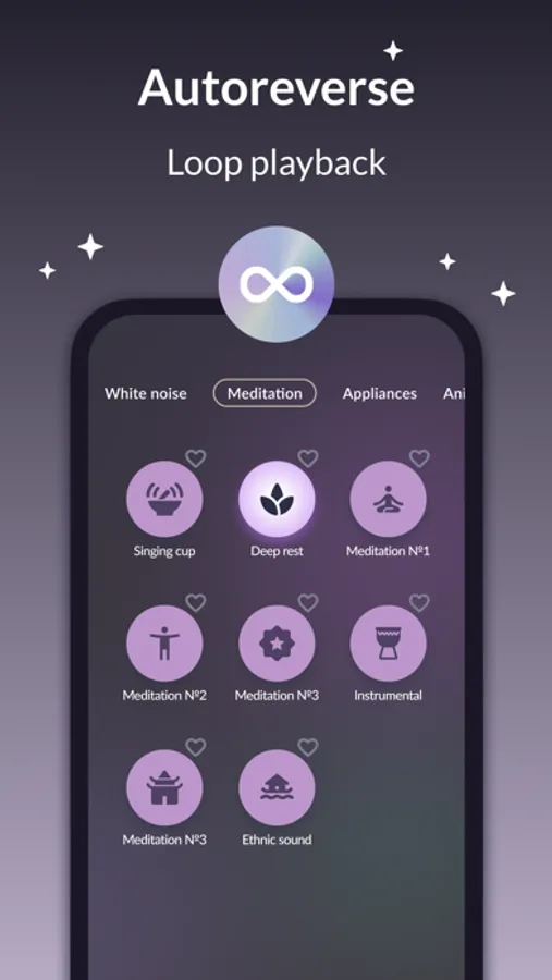 Another function is endless offline audio playback: enjoy sleep music and peaceful atmosphere at any time, even without an Internet connection. Each sound is free and can be played endlessly. You also can use a timer to end your meditation session or continue sleep without noise. If you have favorite sounds, you can always add them to your favorites for quick launch.