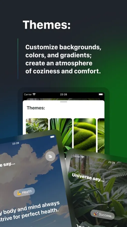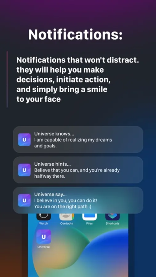 The Universe say – your personal space of harmony and tranquility! This unique application is designed for you and your well-being. In this virtual space, you will immerse yourself in an atmosphere of harmony, receiving guidance, motivation, and inspiration from the Universe itself. Allow yourself to receive daily doses of positive affirmations and support that will remind you of the importance of the moment and the power of your inner peace. Notifications on your phone will be like stars in the sky, reminding you of the beauty of every moment. The endless stream of affirmations will fill your days with inspiration. Let's create a space together where each breath is filled with tranquility.