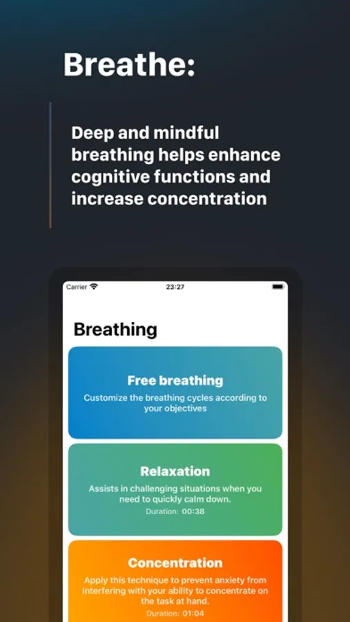 The boundless power of breath is gathered in one place – in the "Breathing" section. Our breathing exercises will help you focus, relax, or quickly dive into sleep. You can also customize the cycles according to your requirements: to invigorate, relax, or concentrate. Breath management is simple and beneficial.