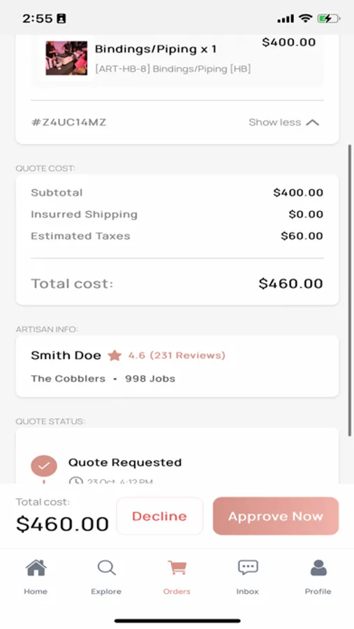 Sent bag in had chat with cobbler. My bag was finished, opened pics and went to approve it and now all I get is a blank screen I don’t know if my payment went through or what’s going on now. The app is terrible and tried doing another quote and it freezes and glitches. Makes me not want to do business again.