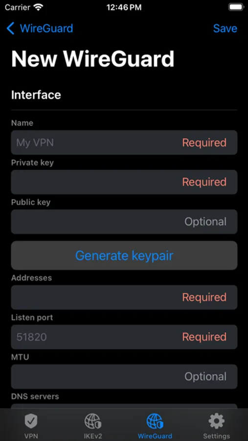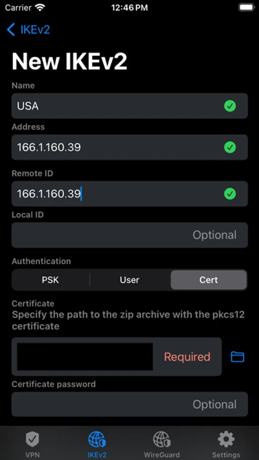 Profile Creation: Easily create new VPN profiles, specifying parameters such as the server, port, authentication methods, and other settings.