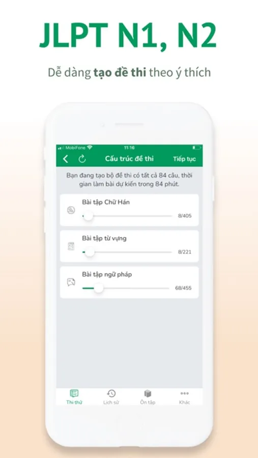 2. Tạo đề thi theo ý thích: JLPTify - Ôn thi N1 cho phép người dùng tạo ra các đề thi tuỳ chỉnh theo ý thích mà không gặp bất kỳ giới hạn nào. Bạn có thể chọn số lượng câu, chủ đề và thậm chí lựa chọn từng câu hỏi trong các phần khác nhau để tạo ra đề thi phù hợp với nhu cầu học tập của mình.