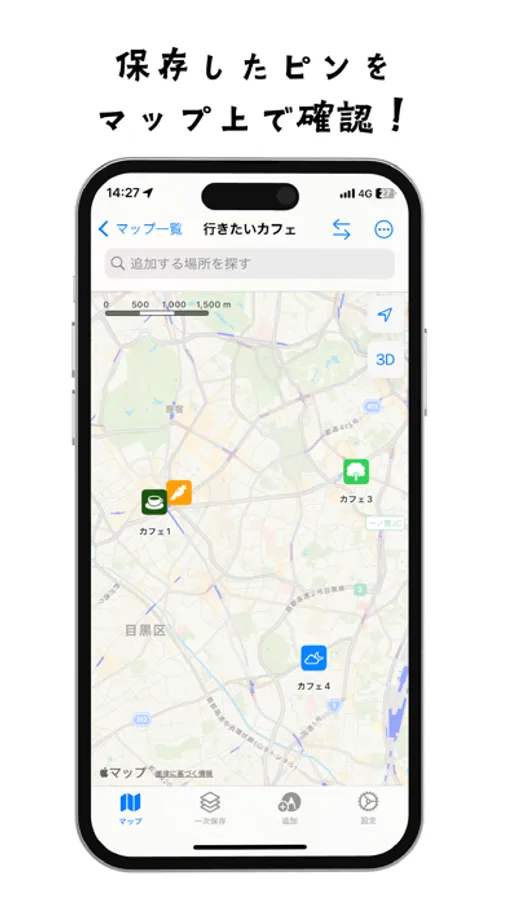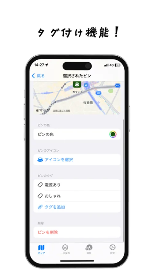 現在地をワンクリックで一時保存ピンとして保存することができます。ピン追加のめんどくささを軽減します。