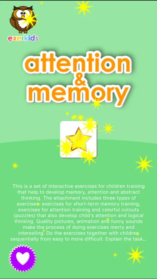 This is a set of interactive exercises for children training that help to develop memory, attention and abstract thinking. The attachment includes three types of exercises: exercises for short-term memory training, exercises for attention training and colorful cutouts (puzzles) that also develop child’s attention and logical thinking. Quality pictures, animation and funny sounds make the process of doing exercises merry and interesting. Do the exercises together with children sequentially from easy to more difficult. Explain the task to the children and help them if troubles appear.