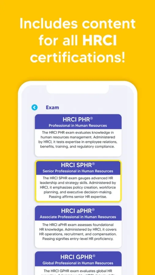 We include practice exams and quizzes for all four HRCI exams: PHR, SPHR, aPHR, and GPHR. Our content is organized by exam type for study convenience.