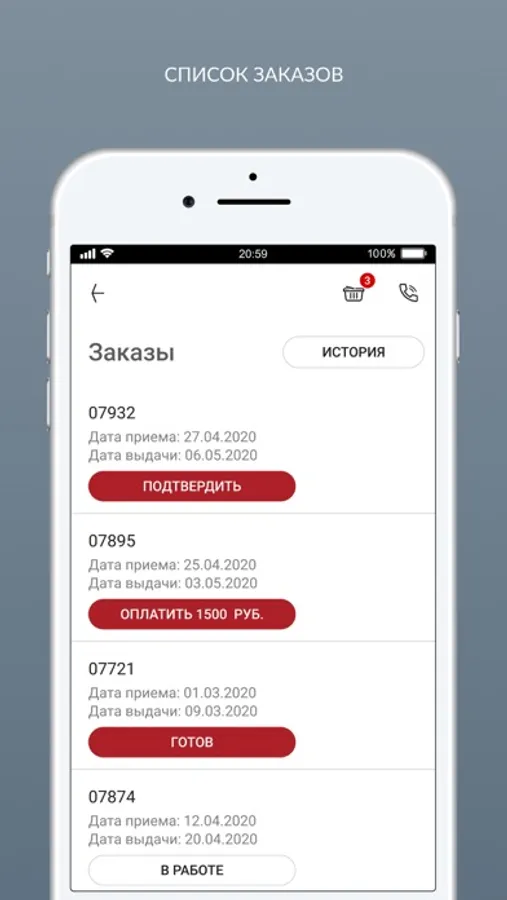 - посмотреть свои заказы в работе, их статусы, историю заказов;