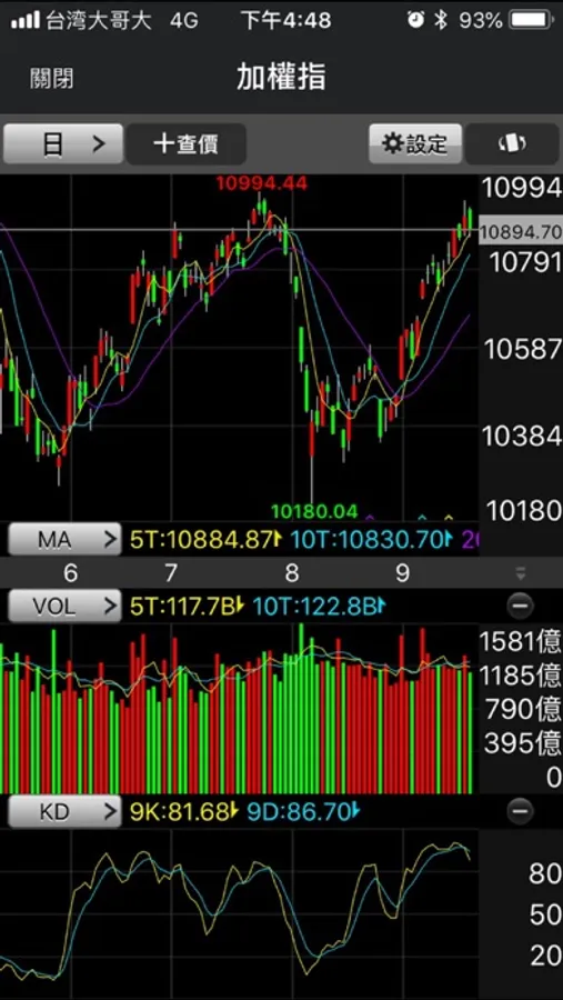 -技術線圖:支援5分鐘、60分鐘、日、周、月線圖,可觸控指標切換成交量、RSI、KD、MACD、PSY等技術指標,並切換橫置顯示。