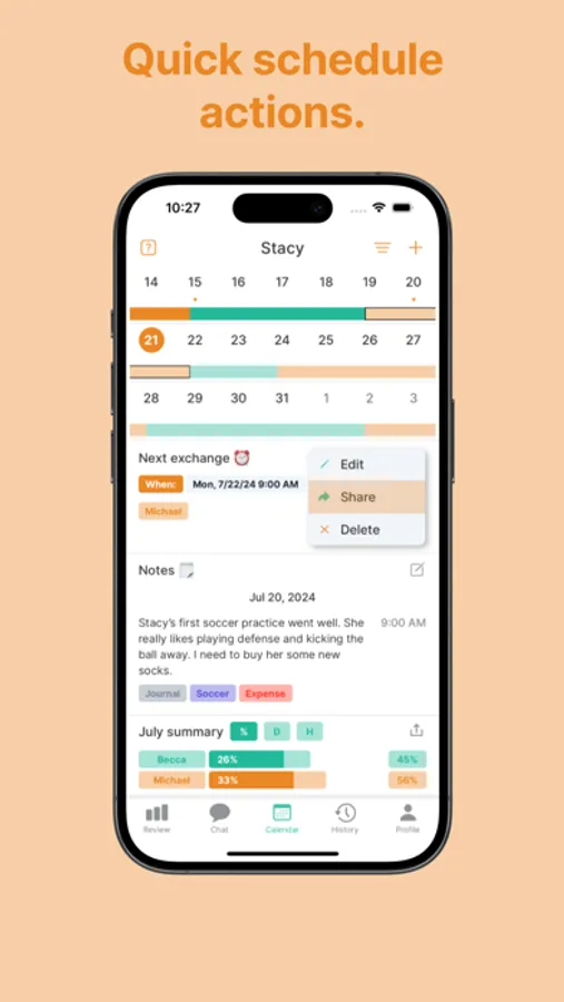 Invite your coparent and share all of your parenting time in one schedule. Calendar creators have the ability to control the abilities of other coparents on the calendar.