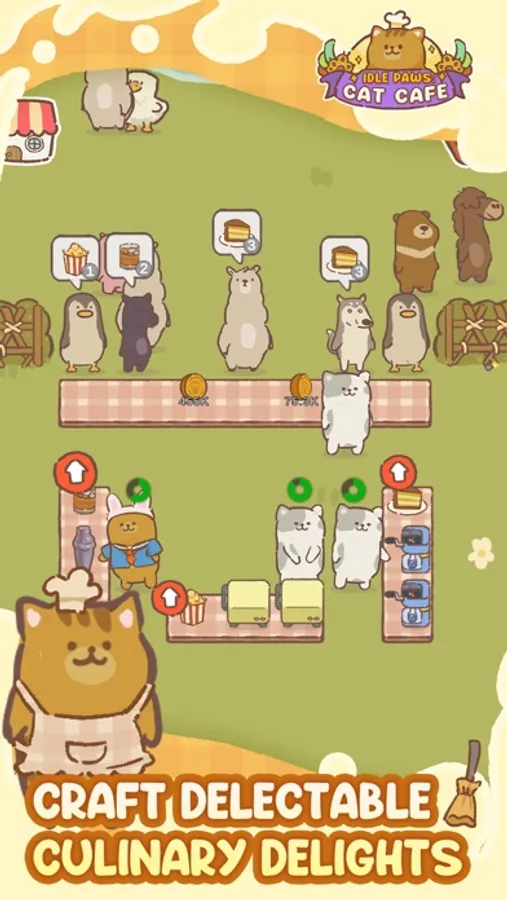 In Idle Paws Cat Cafe, you play as a gourmet chef operating out of a unique cat cafe. Use your cooking skills to create a variety of delicious dishes that will please guests and adorable cats alike. Cultivate your cat team, attract more customers, unlock new recipes and decorations, and create unique cat cafes. Enjoy cooking and cats and build your food empire in this relaxing business simulation!