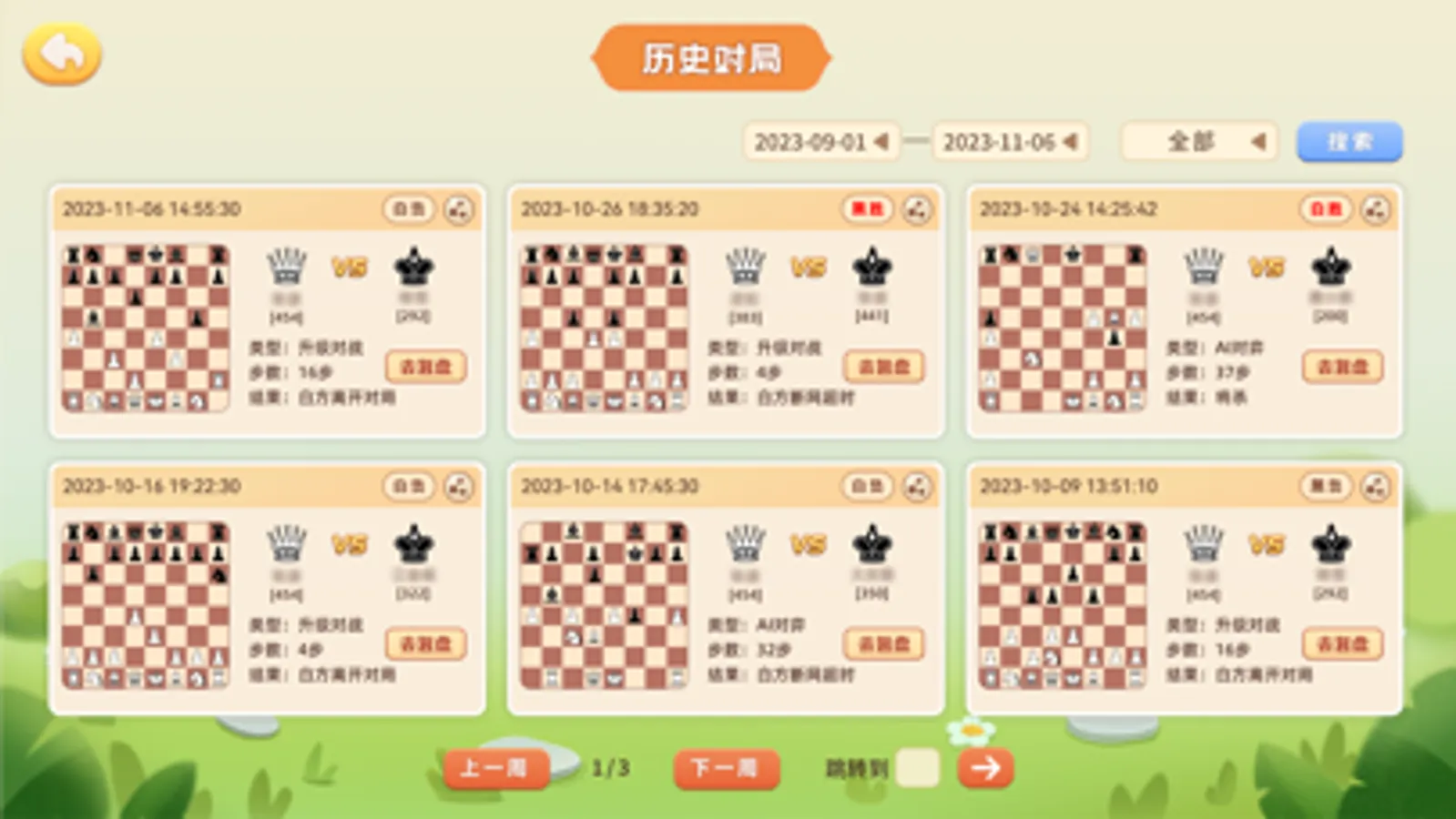 ——历史对局—可通过搜索年份和月份,切换对应的历史对局,记录用户升级对战和AI对局的历史对局,每天10分钟,智能复盘,帮助快速学习国象;