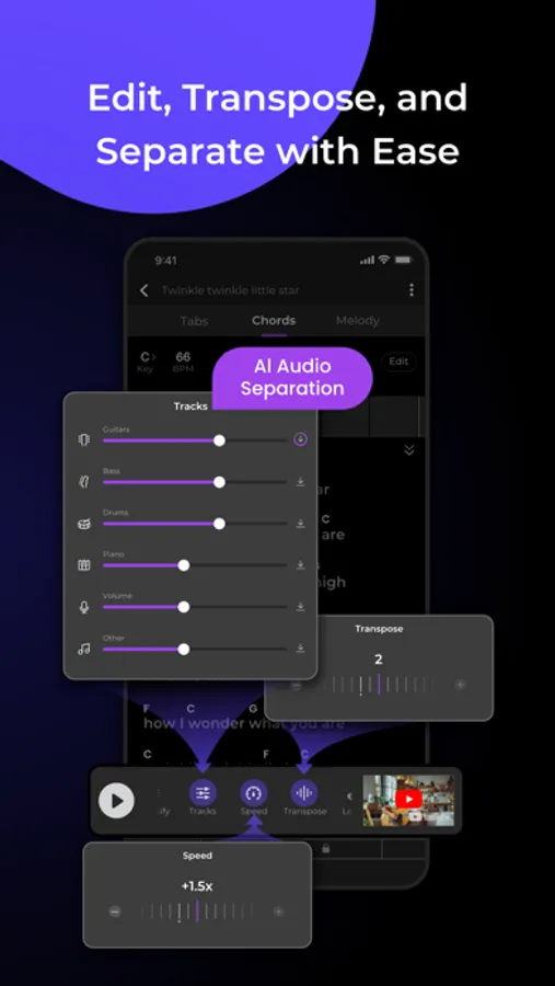 Accurately extract chords, tabs, melodies, and lyrics from any song, and edit with ease. Transpose and separate tracks effortlessly. Enjoy synchronized play of chords, lyrics, and video. Features include standard Transpose, Smart Transpose (real-time pitch shifting for videos), AI real-time stem separation, Loop (looping selected sections of interest), Speed adjustment (speeding up or slowing down), and more. All functionalities operate in real-time synchronized playback with the video or audio you upload.