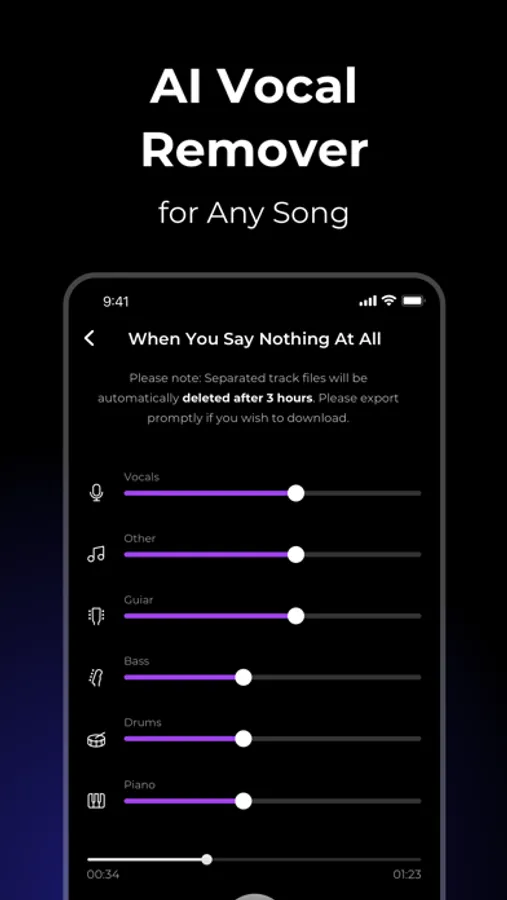 AI-powered audio source separation, based on a hybrid transformer model, achieves high SNR for vocal removal and background removal. It also supports the separation of piano, guitar, bass, and drum instruments.