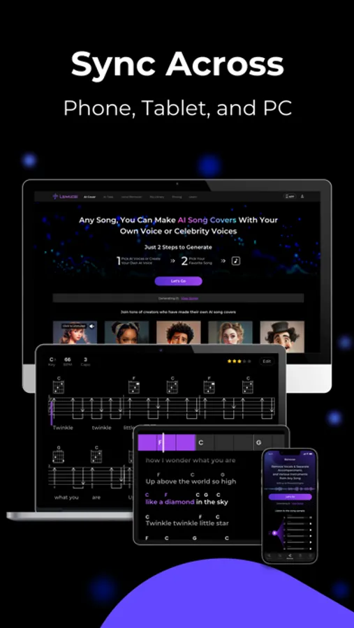 Lamucal, through its powerful AI engine, enables accurate extraction of chords, tabs, and lyrics from any song. It allows you to easily create AI covers with your custom voice for any song and provides AI Vocal Remover, achieving multi-track separation with one click. Additionally, it offers essential tools for daily music learning.