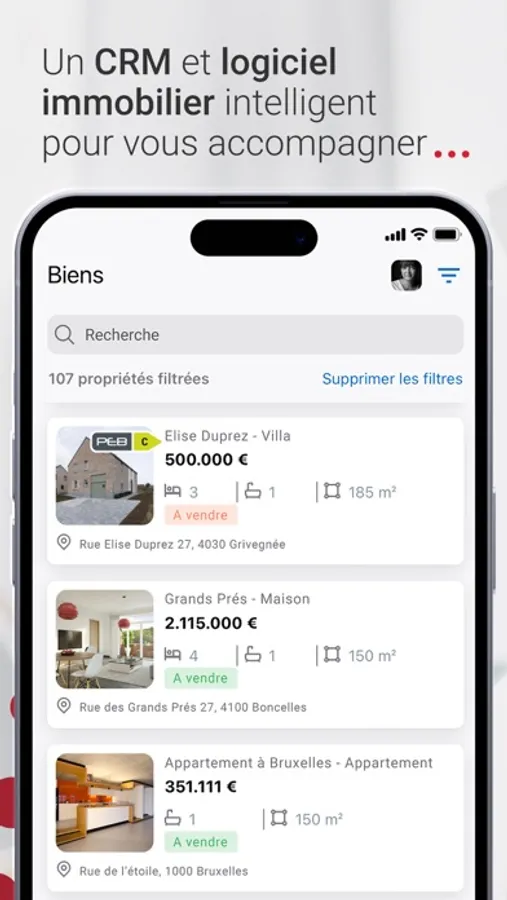 • Integrated services such as direct access to property portals and numerous service providers (for energy certificates, virtual visits, managing client reviews, text message services, video calls…)