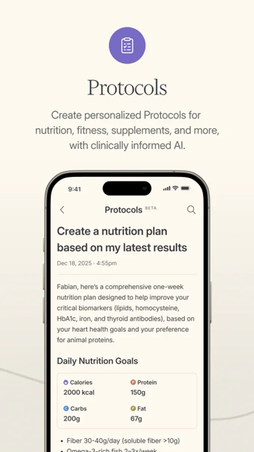 Translate your lab results, scans and health history into clear, evidence-based plans for nutrition, activity, and supplements—all customizable to your goals and preferences.