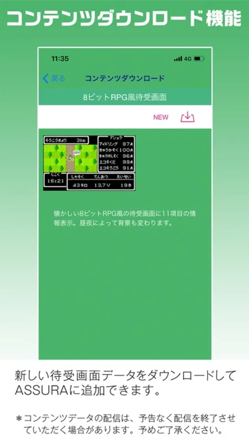 後から待受画面や警告画面を収録したコンテンツデータをダウンロードし追加できます。