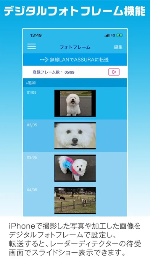 iPhoneのカメラ機能を使って撮影、またはフォトギャラリーの画像をASSURAで利用できるデジタルフォトフレーム用データに変換します。