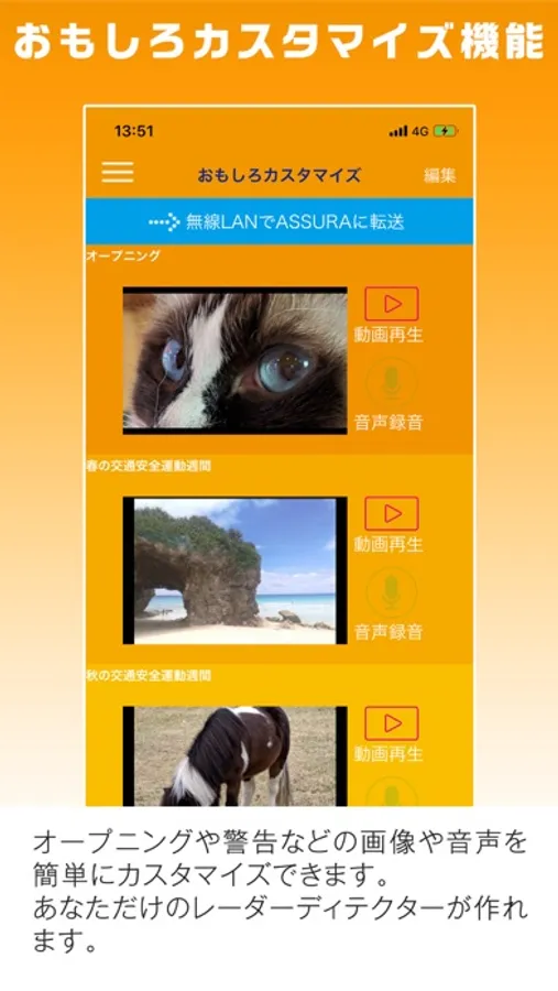 ASSURAのオープニングや警告、案内の画像や音声をiPhoneを使って、カンタンにカスタマイズすることができます。画像は、iPhoneのカメラ機能を使って撮影、またはカメラロールの画像を登録します。音声は、iPhoneのマイク機能を使って録音し登録します。