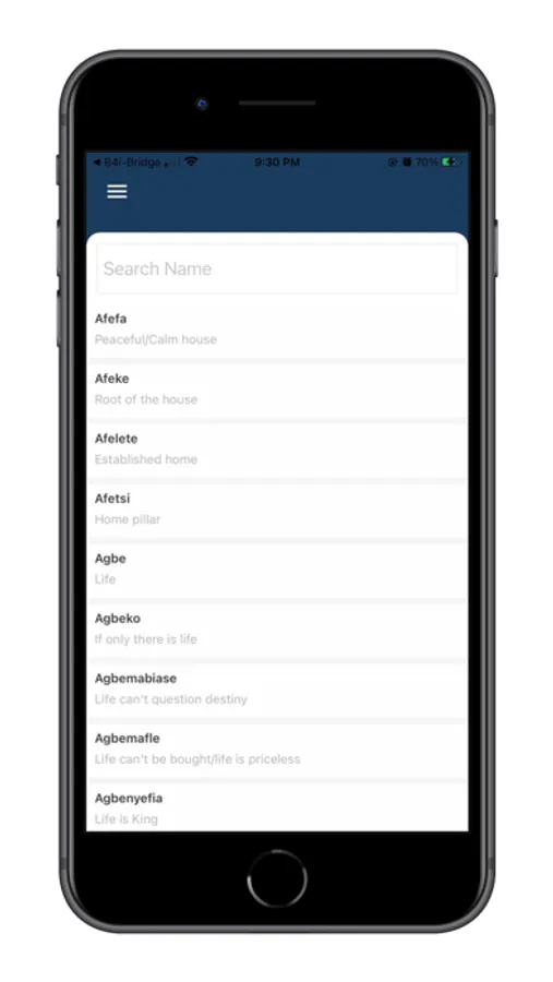 This App was developed to uphold the culture of the people of Volta(#9) Region. The App focus on the Names and their Meanings of the people of Volta Region-Ghana. Users can save Names as Image and Share on other Platforms