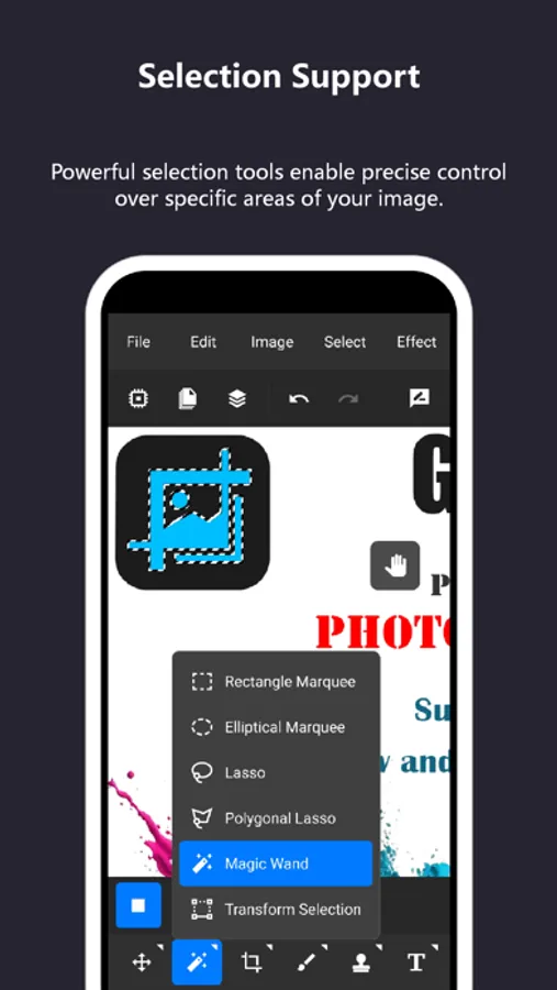 TinyPs offers a variety of tools to complete most common graphic editing operations, such as crop, perspective crop, move, free transform, rectangular selection, elliptical selection, lasso selection, polygonal selection, magic wand selection, transform selection, pencil, brush, paint bucket, gradient, eraser, eyedropper, clone stamp, quick copy, blur, mosaic, red-eye, liquify, text, shapes, pen, and more.