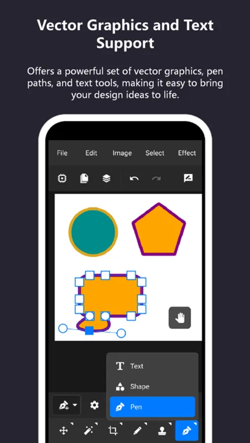 TinyPs offers powerful shape and pen tools, along with a variety of menu commands for creating and editing vector graphics.