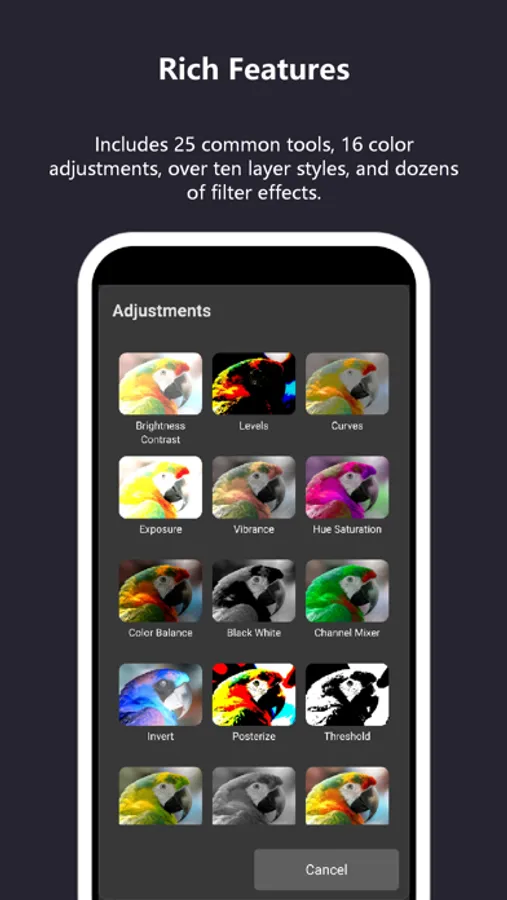 TinyPs provides 16 color adjustment functions, including brightness/contrast, levels, curves, exposure, vibrance, hue/saturation, color balance, black and white, channel mixer, invert, posterize, threshold, selective color, desaturate, equalize, tint. It offers 10 layer style effects, including bevel and emboss, stroke, inner shadow, gloss, color overlay, gradient overlay, pattern overlay, outer glow, drop shadow. It also provides dozens of common image filters such as Gaussian blur.