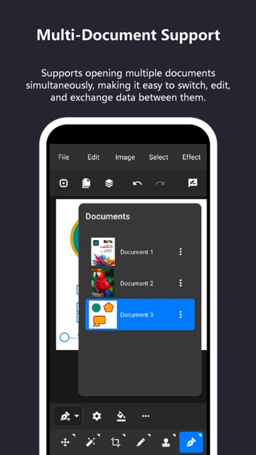 TinyPs allows editing multiple documents simultaneously, making it easy to switch and exchange data between documents.