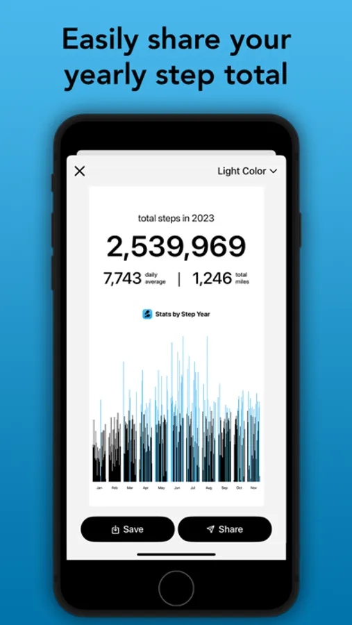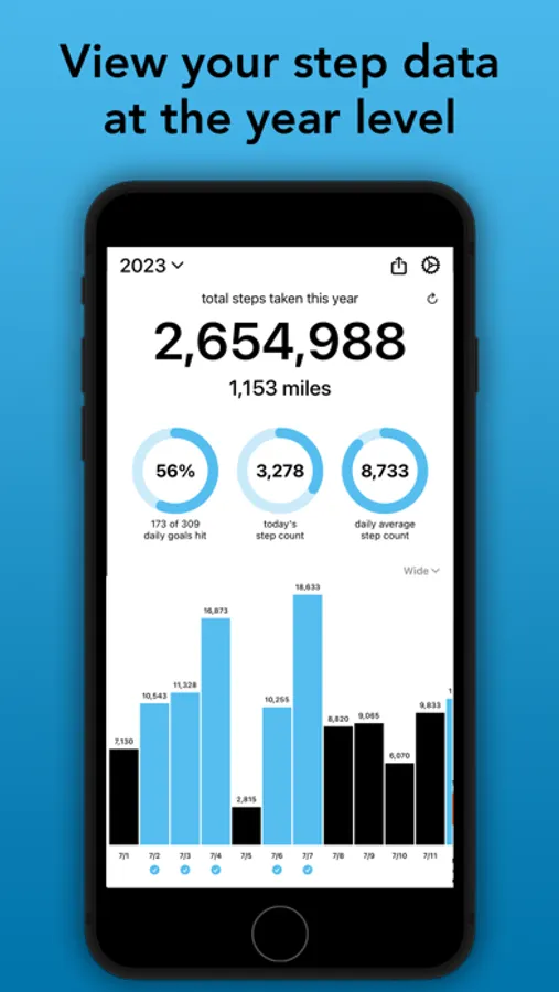Review your step data from a bird's eye view! Have fun scrolling and tapping around to see photos you took that day. Jog your memory on why you took that many steps!