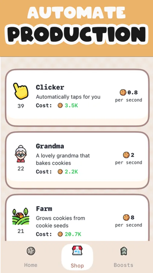 • Invest your cookies into automatic tap machines or upgrades to increase production!