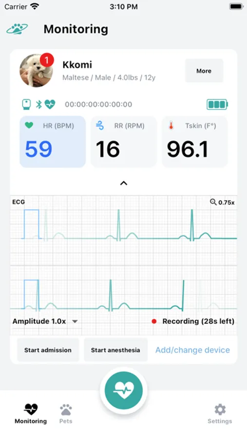 Monitoring animal's vital signs from O'Pet Curv via Bluetooth.