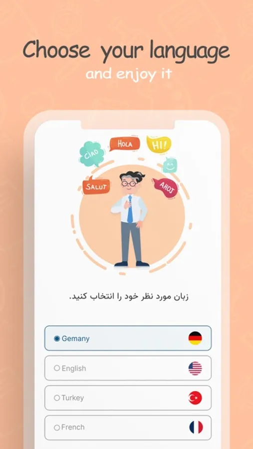 Shahin Language application is provided to teach different languages for Persian speakers.