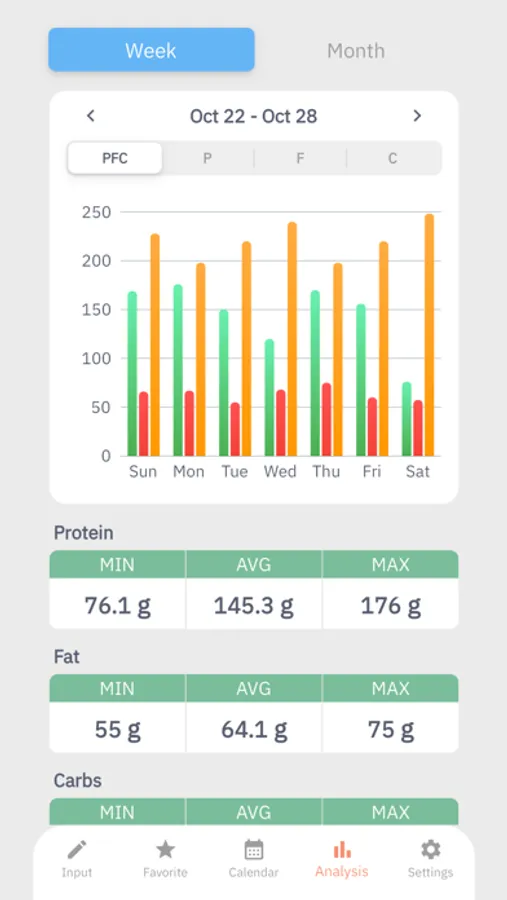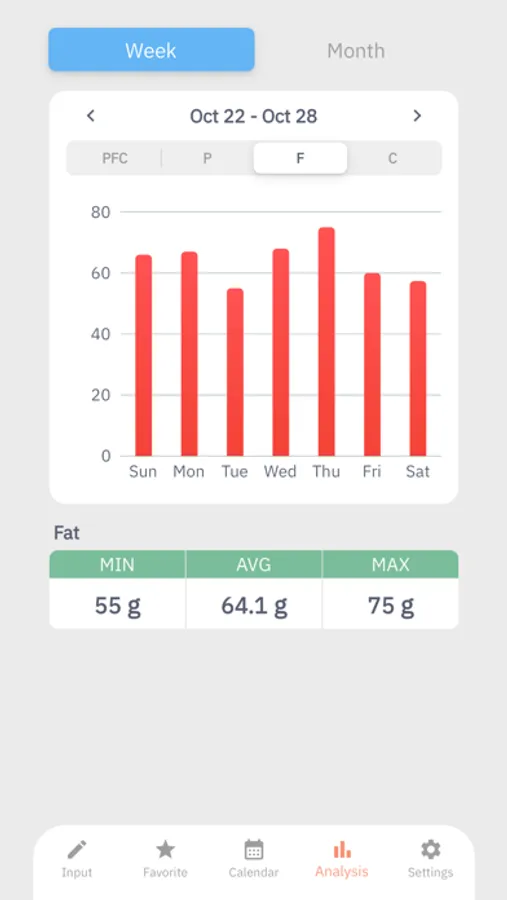 On the "Analysis" screen, you can view your weekly and monthly PFC intake through charts, which is useful when reviewing your diet and eating habits.