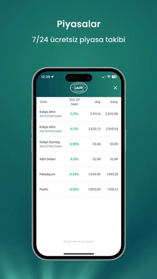 Altın ve gümüş alım satımı hiç bu kadar kolay olmamıştı. Hemen IARPlatform uygulamasını indirebilir ve uygulama içerisindeki pek çok özelliklerden ücretsiz ve üye olmadan da faydalanabilirsiniz.