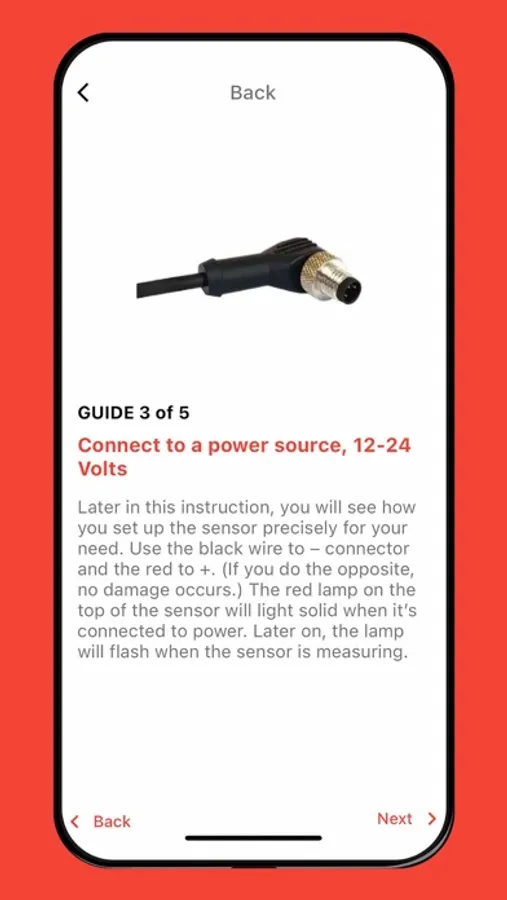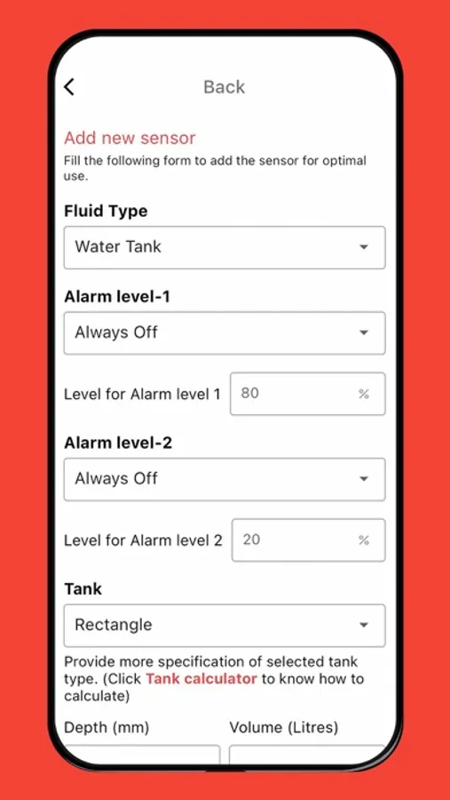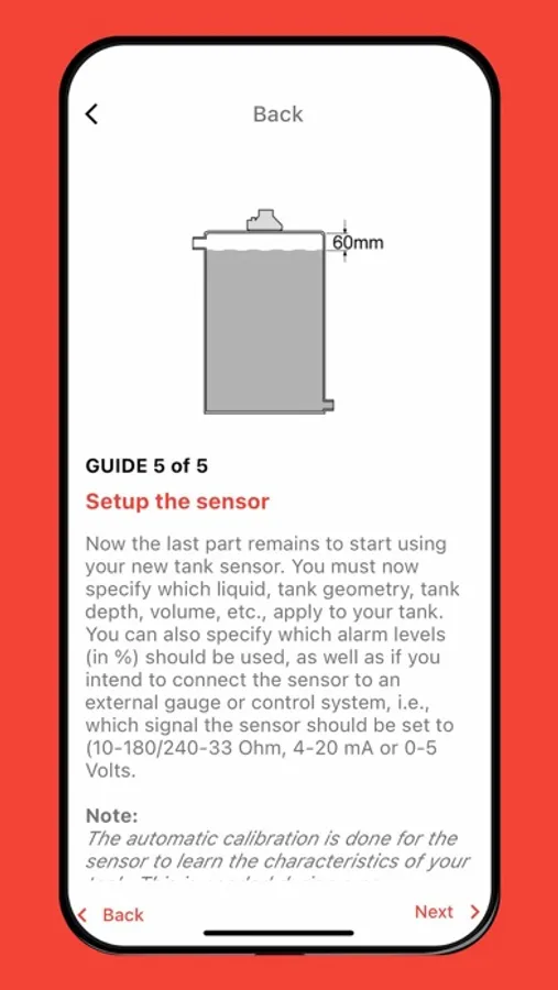In the app you have everything; Installation Guide with instructions for mounting the sensor on the tank, setup/calculation and displaying the fluid level in different colors. The app has also a Tank Calculator for non-rectangular tanks, such as round and triangular tanks. Installation should take no longer than 15 minutes
