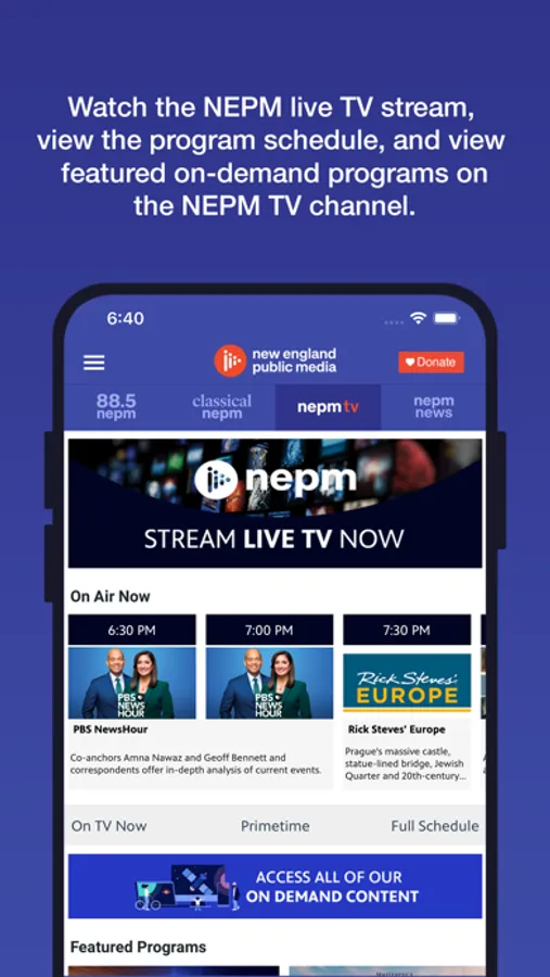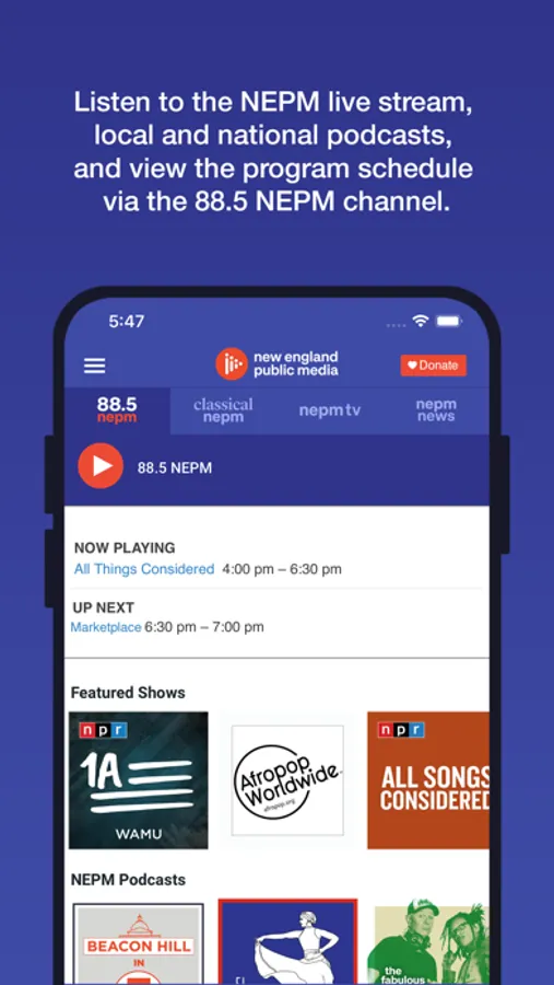 The app provides on-demand content of all your favorite TV and radio shows, livestreaming 88.5 NEPM, Classical NEPM, and NEPM TV, and easy access to the radio and TV program schedules plus the ability to explore additional content!