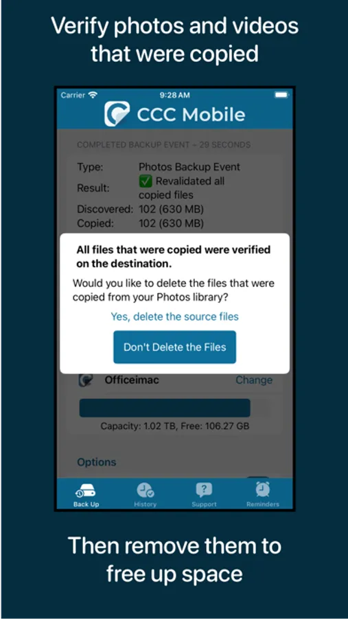 Looking to offload some photos from your mobile device? CCC mobile can verify the files that were backed up, then offer an option to delete those files from the source to free up space.